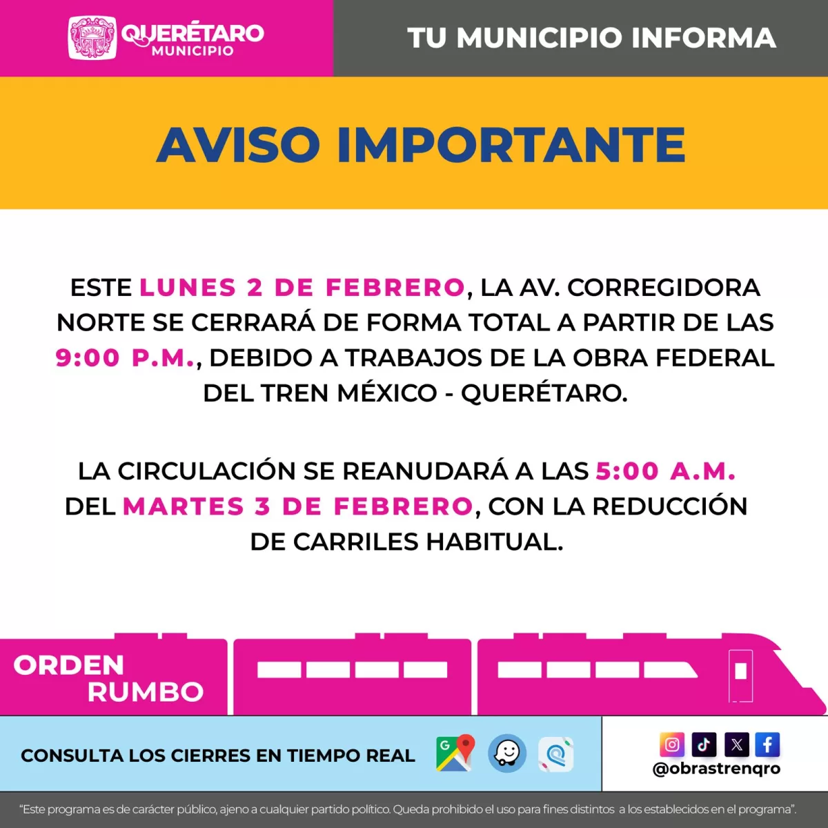 La medida, que entrará en vigor a partir de las 21:00 horas, responde a la ejecución de trabajos de infraestructura bajo la jurisdicción del Gobierno Federal, como parte del proyecto ferroviario que conectará a la Ciudad de México con la capital queretana.