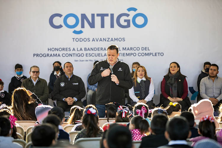 En el marco de los honores a la bandera en la escuela primaria “Lic. Adolfo López Mateos”, en el municipio de San Juan del Río, Kuri González subrayó que el beneficio de este programa de alimentación que lo acompaña, opera en 104 escuelas y beneficia a 11 mil 447 alumnos, cuenta con una inversión para el ciclo 2022-2023 de 110 millones de pesos y ofrece apoyo económico a directores, docentes y personal administrativo. Además, contempla acondicionamiento de escuelas y capacitación a su personal.