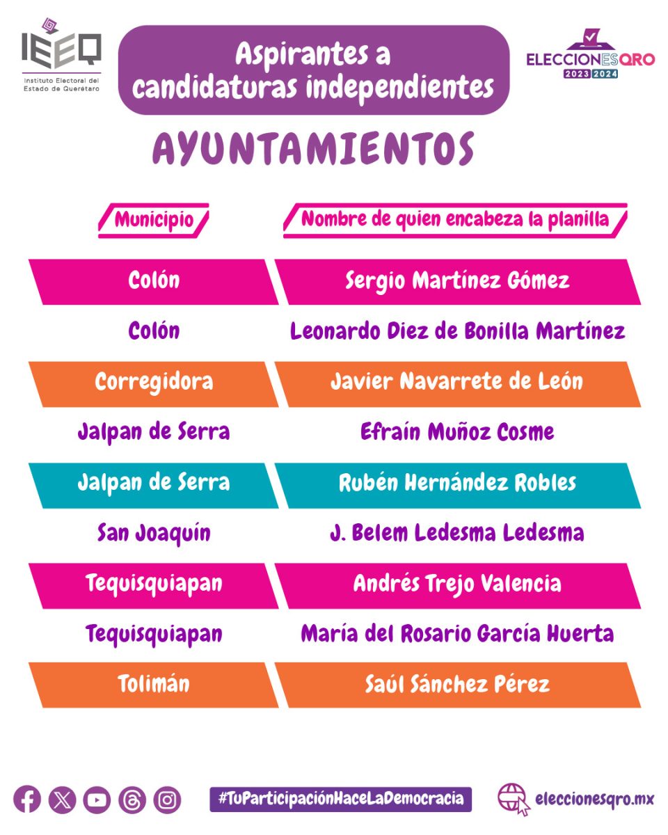 Las personas que encabezan las planillas son: Sergio Martínez Gómez y Leonardo Diez de Bonilla Martínez en el municipio de Colón; Javier Navarrete de León en Corregidora; Efraín Muñoz Cosme y Rubén Hernández Robles en Jalpan de Serra; J. Belem Ledesma Ledesma en San Joaquín; Andrés Trejo Valencia y María del Rosario García Huerta en Tequisquiapan, así como Saúl Sánchez Pérez en Tolimán.