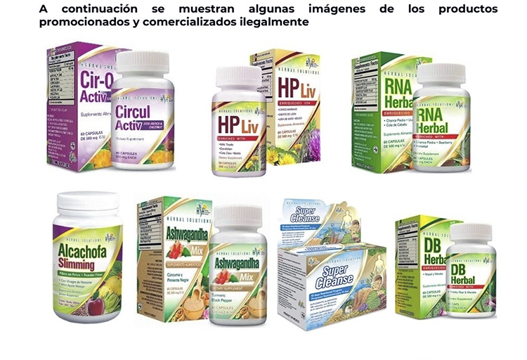 Dentro de las acciones de vigilancia sanitaria y evaluación de riesgos, se detectó que la marca HERBAL SOLUTION´S HEALTH cuenta con diversos productos, entre los que se encuentran: Alcachofa Slimming, Artichoke Tea, Artichoke capsules, Alcachofa Slim Shake, Digest Clean Fiber y Caps, PAR Siclean, HP-A Herbal Tea, HP Liv, Fiber with Pineapple, Pineapple Tea, Pineapple Herbal, AlpisChia Milk, Alpiste Milk, Clorofila, Super Cleanse, Herba Linaza Premium, Brazil Tea, Bailarina Herbal Tea, DG-S Herbal Tea, Herbal DSG-S, Herbal Gax-3, GS- tri Herbal Tea, Herbal SL, Chia Seed Fiber, Agave Inulin Premium, Inulina de Agave Premium, Raspberry Ketone, Chinese Tea, RD Fast Plus, Multi Complex, Moringa Tea, Moringa, Procel-OX, Nutri Complete Shake, Super Vital, Pentre Herbal, Noni & Mangosteen, Super Omega, Car-D Herbal, Herbal PRS, Cir-Q Activ, CIR –Q Herbal Tea, Curcumin MIX, Cúrcuma MIX, Herbal FLX, Gluko Soya, R+Dol Herbal, J-veness Colágeno y Ener Vital.