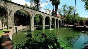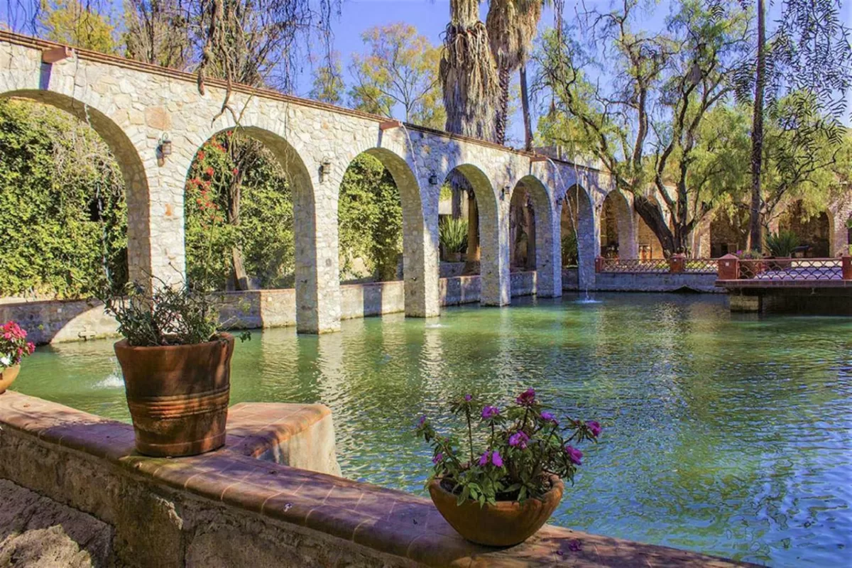 Edificada principalmente con adobe y piedra, y enlucida con cal, la hacienda está situada sobre una galería de filtración que aún hoy proporciona agua a la zona.