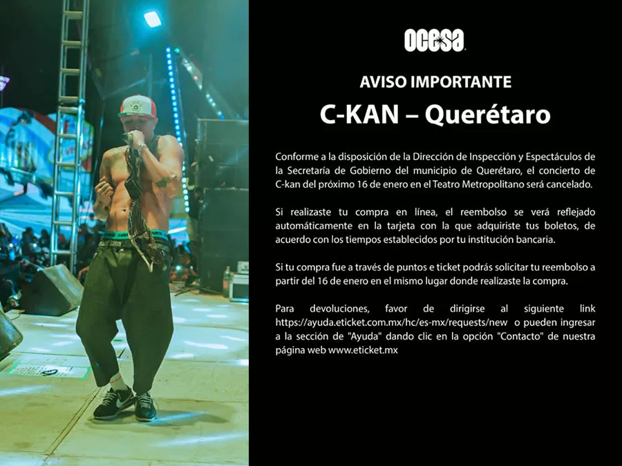 El Municipio de Querétaro anunció la cancelación oficial del concierto del rapero C-Kan, el cual estaba programado para llevarse a cabo este viernes 16 de enero de 2026 en el Teatro Metropolitano.