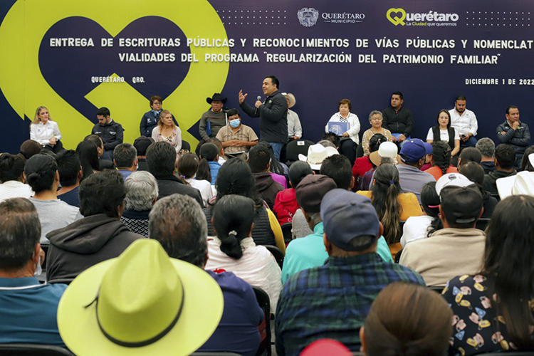Con la finalidad de contribuir a que más familias tengan certeza sobre su patrimonio e incorporarse al desarrollo urbano en la ciudad que queremos, el Presidente Municipal, Luis Nava, encabezó la entrega de escrituras y reconocimientos de vías públicas y nomenclaturas de vialidades del programa «Regularización del Patrimonio Familiar», que beneficiarán a familias y localidades de las delegaciones Santa Rosa Jáuregui, Félix Osores Sotomayor y Felipe Carrillo Puerto.