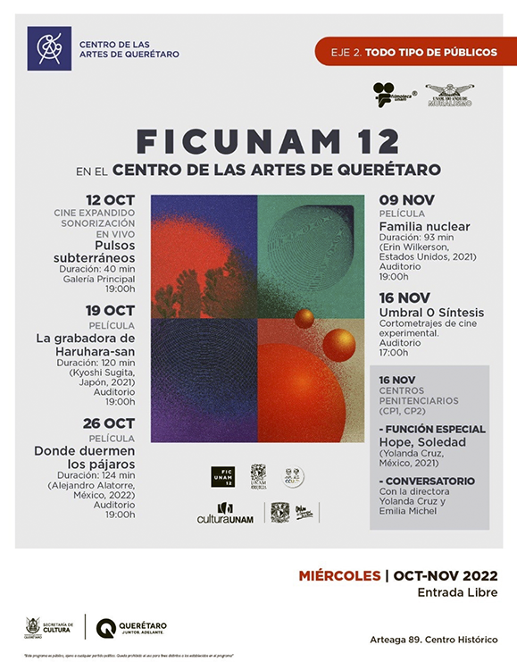 La Secretaria de Cultura (SECULT), a través del Centro de las Artes de Querétaro (CEART) participará del 12 de octubre al 16 de noviembre en el Festival Internacional de Cine UNAM que en esta edición llegará a más de 20 sedes en 17 estados del país.