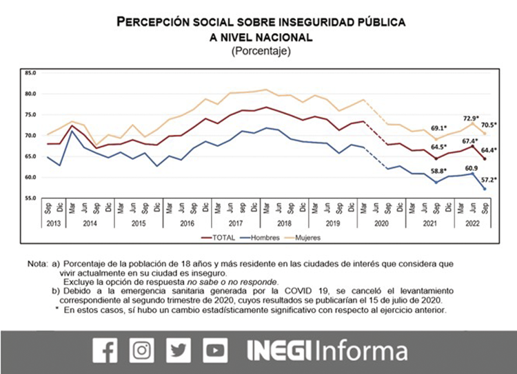 La ENSU de junio de 2022 reportó que el 67.4% de los mexicanos consideraba que vivir en su ciudad era inseguro; en septiembre de 2022 la cifra descendió a 64.4%.