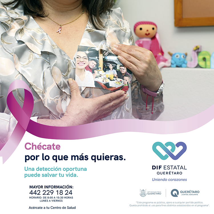 En apoyo a lucha contra el cáncer de mama, el Sistema Estatal DIF lanza la campaña “¡Chécate! ¡Revísate! ¡Autoexplórate! por lo que más quieras”, con la finalidad de apelar al autocuidado e invitar a las mujeres queretanas y, sociedad en general, a promover la cultura de la prevención. El cáncer de mama no respeta edad ni condición social, por ello acudir al médico debe hacerse de forma constante para detectar a tiempo cualquier síntoma e indicio de cáncer mamario.