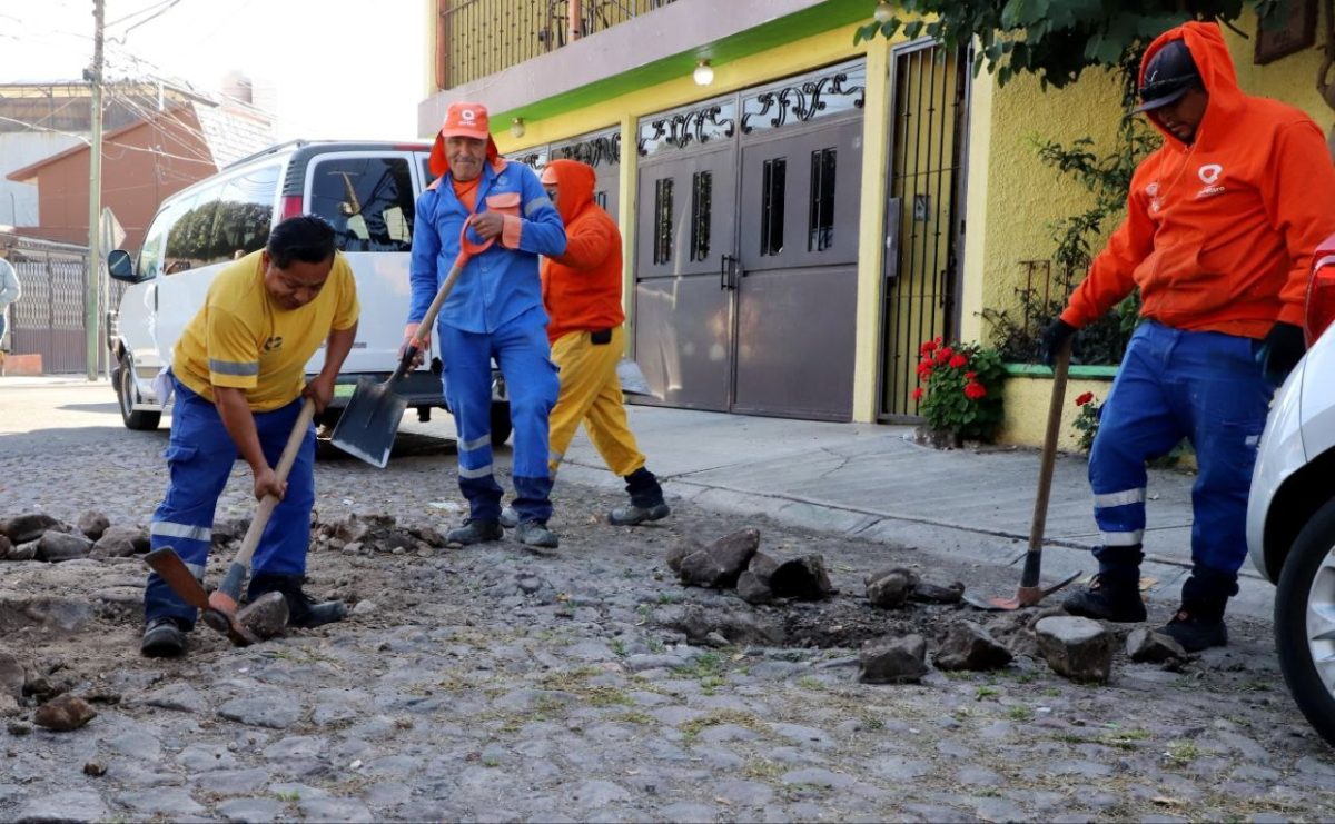 En Las Plazas, se realizaron trabajos de pintura en topes, bacheo de empedrado y adocreto, así como el pintado de jardineras y guarniciones. Además, se realizaron actividades de poda baja, desmalezado, barrido, y la rehabilitación de pasos peatonales con colado en concreto, junto con el pintado de juegos para las niñas y niños de la zona.